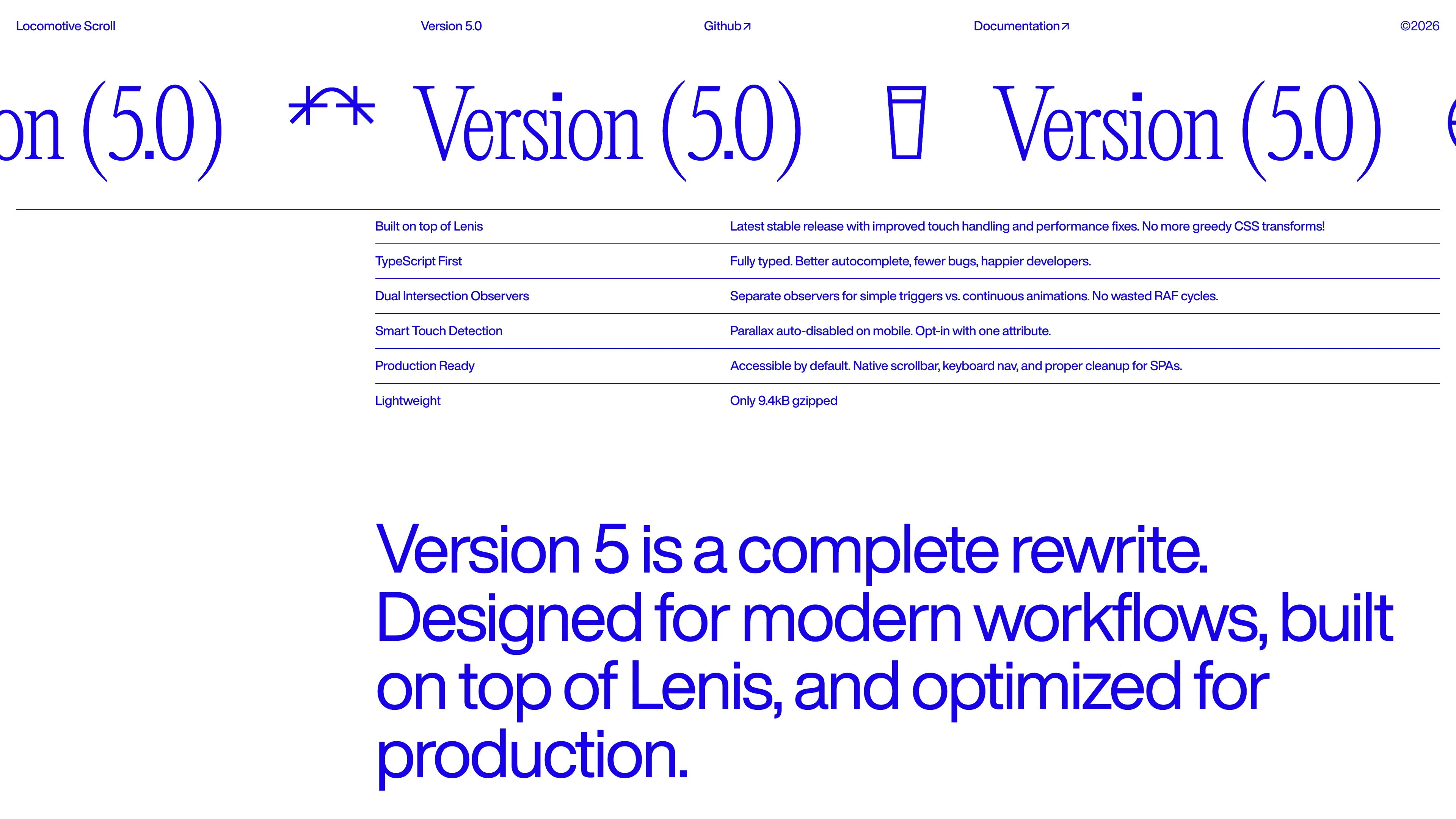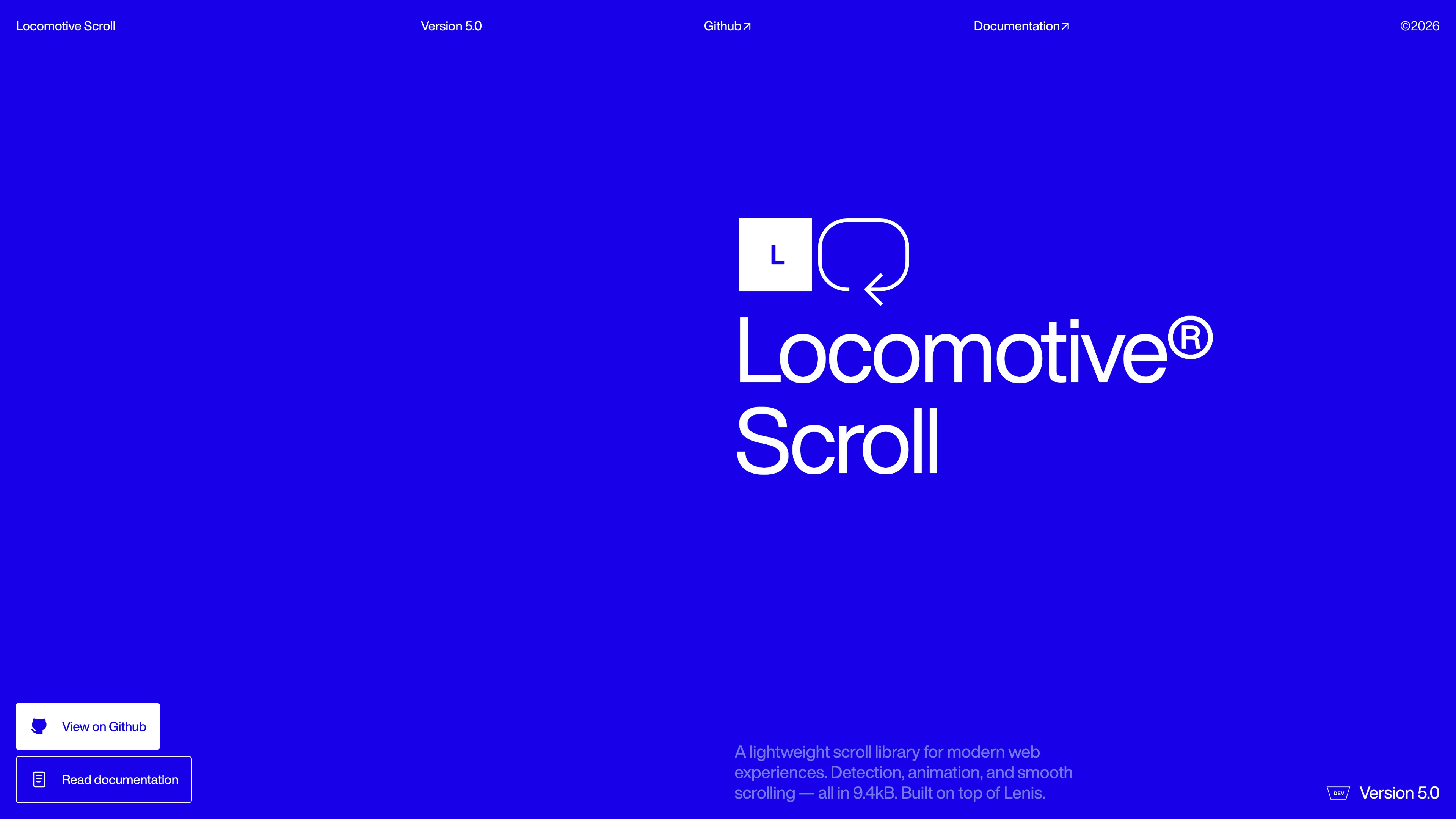 A lightweight scroll library for modern web experiences. Detection, animation, and smooth scrolling — all in 9.4kB. Built on top of Lenis.