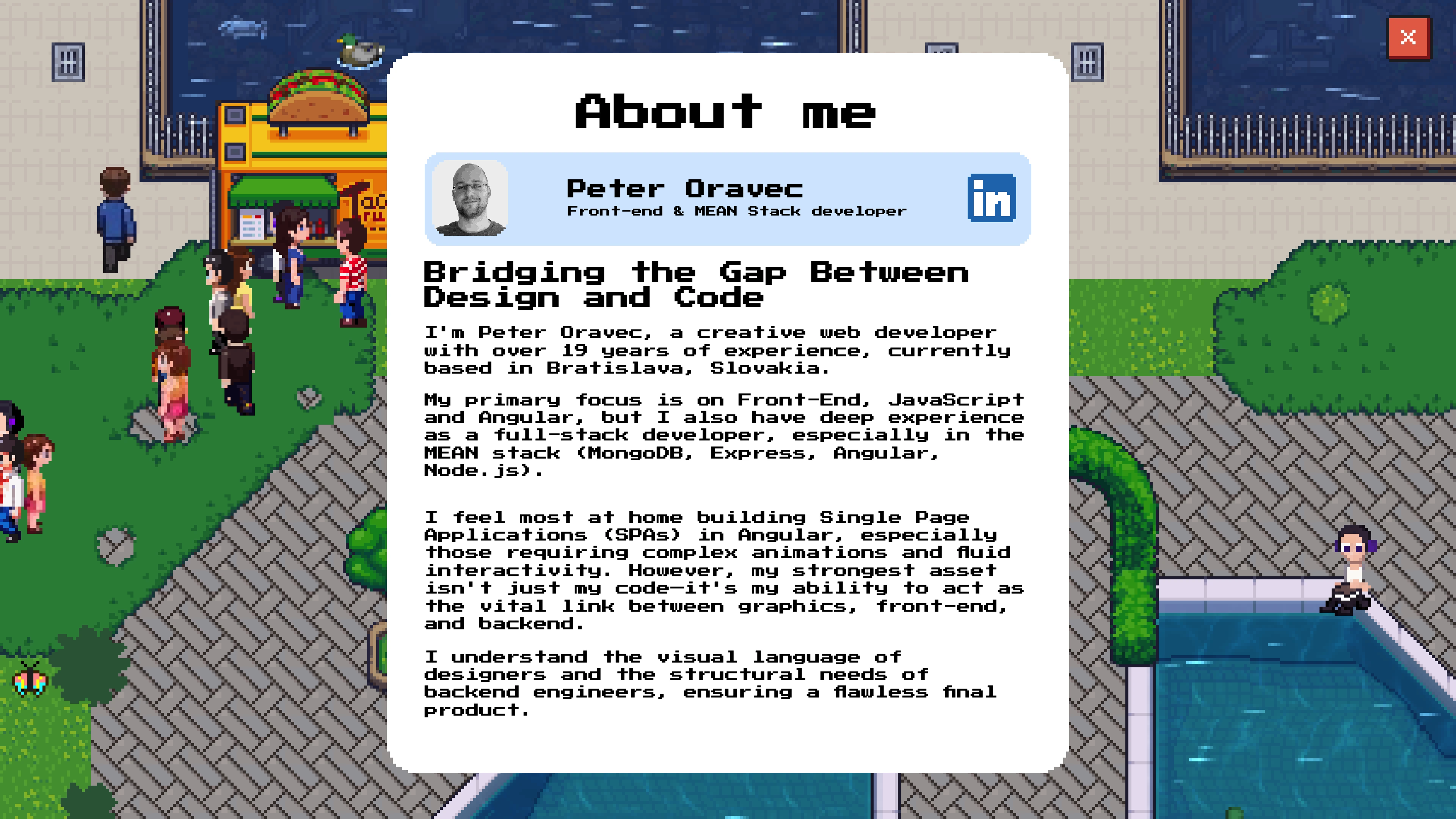 I'm Peter Oravec, a front-end developer with over 19 years of experience. I specialize in Angular, TypeScript, and JavaScript, building modern web applications with a focus on performance and user experience.
